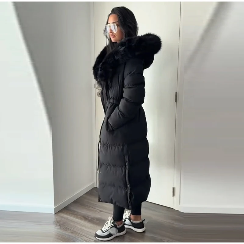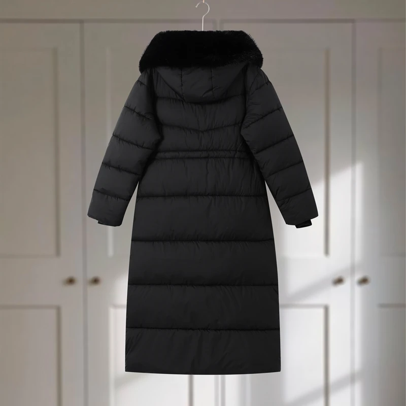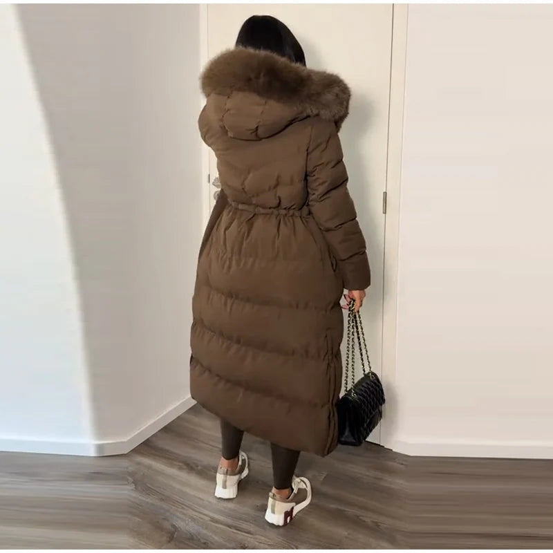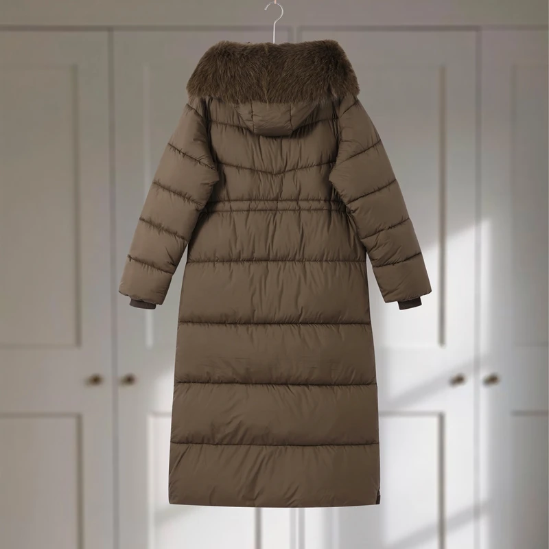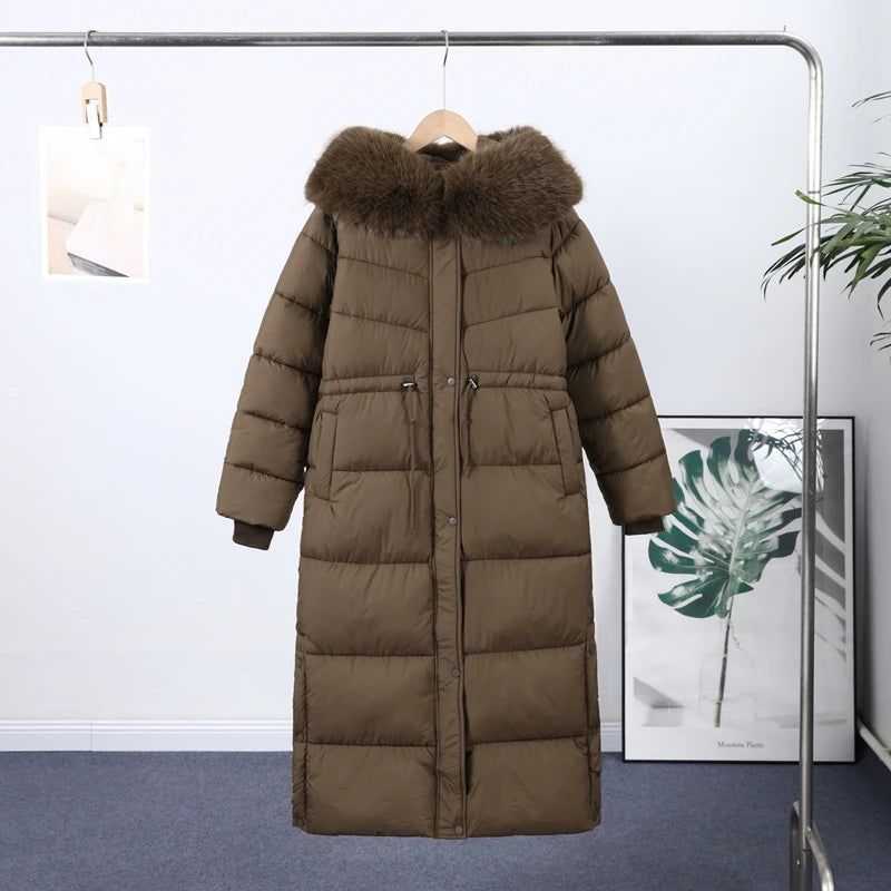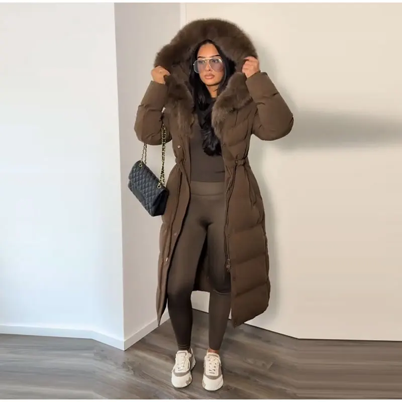 Winter Women Long Down Jacket Fur Hooded Zipper Brown Black Drawstring Padded Cotton Coats Fashion Lady All-matching Outerwear