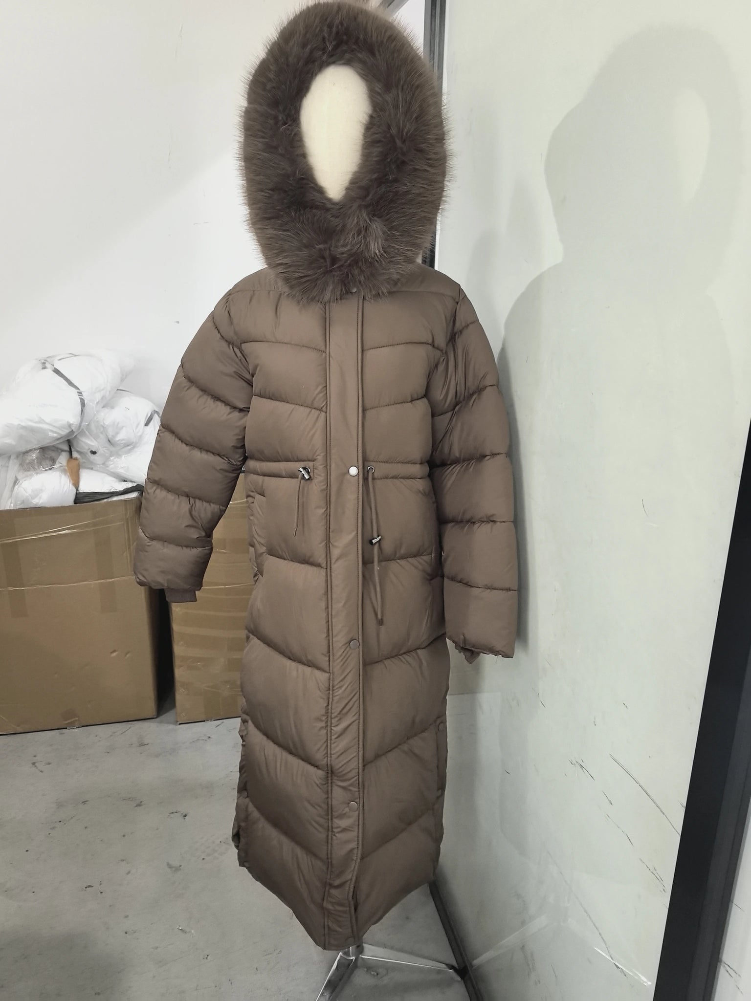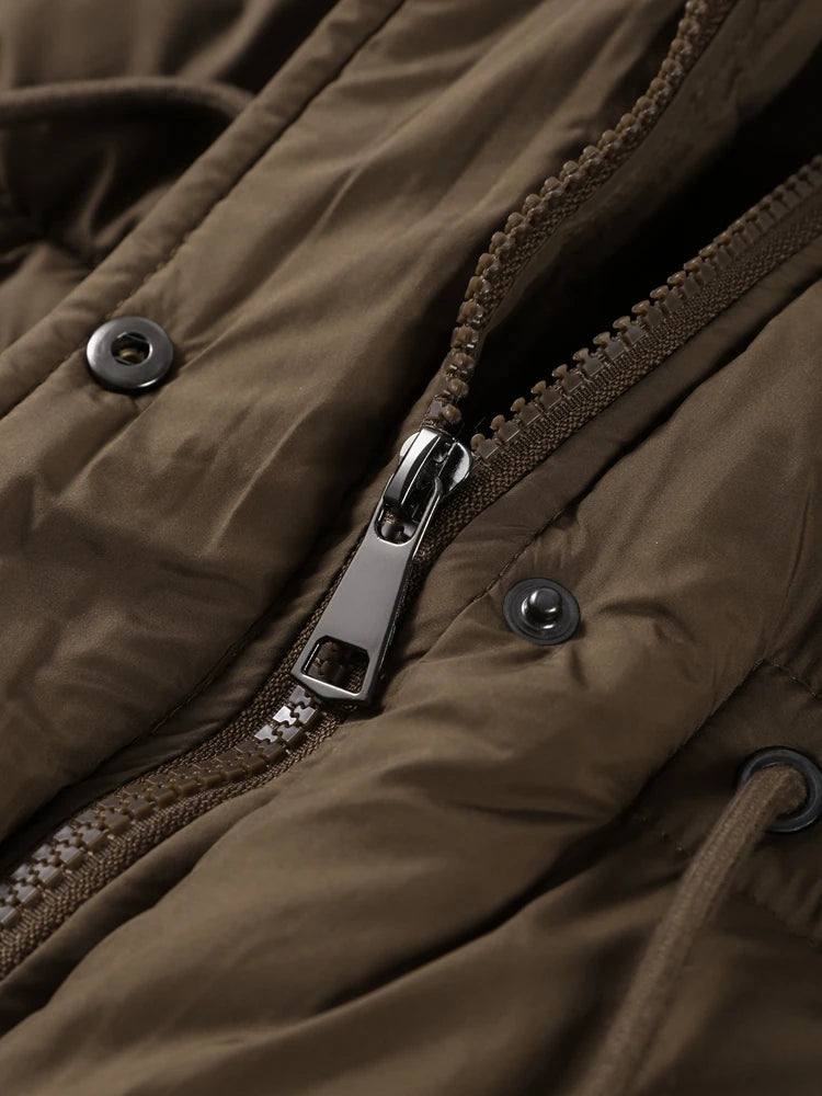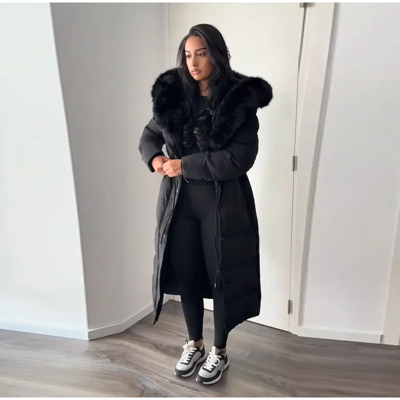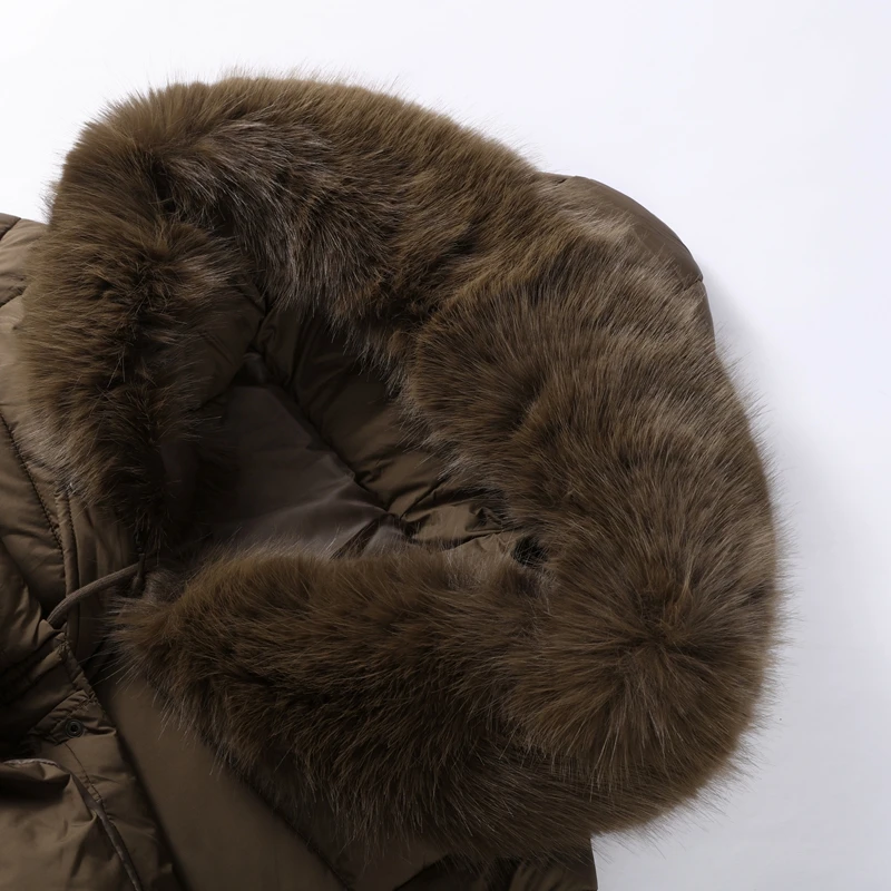 Winter Women Long Down Jacket Fur Hooded Zipper Brown Black Drawstring Padded Cotton Coats Fashion Lady All-matching Outerwear