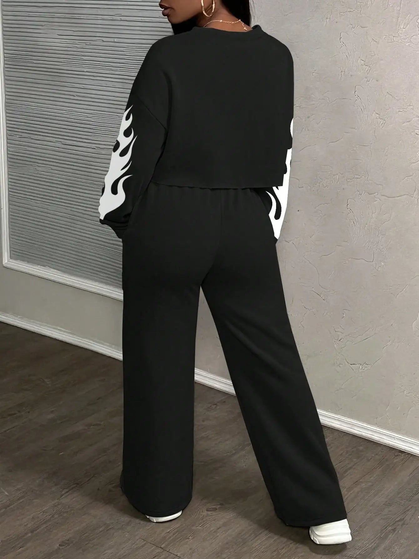 Women's Street Style Flame & Graphic Print 2-Piece Set, Loose Fit, Autumn Winter Casual Wear