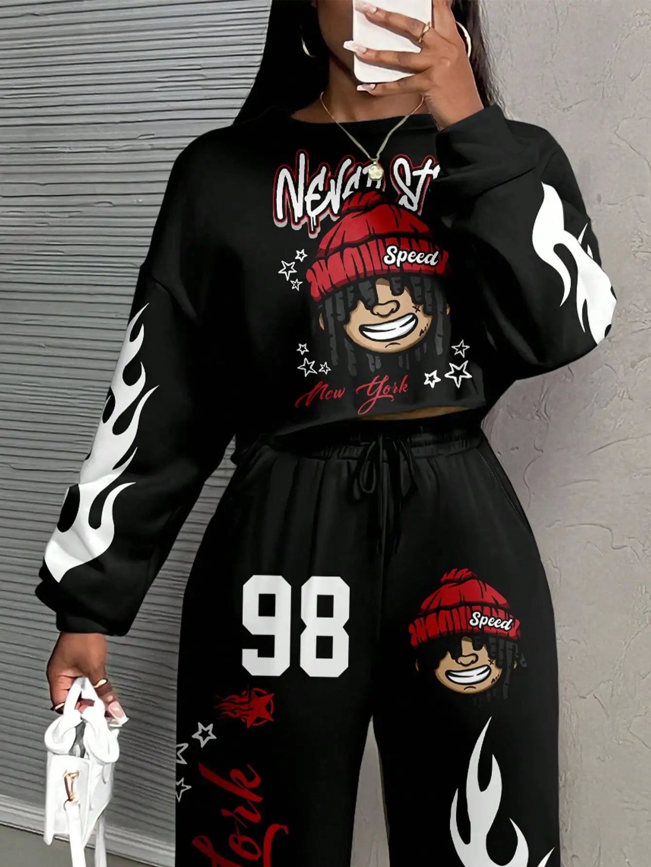 This two-piece set features a cropped long-sleeve top and wide-leg pants in black, both adorned with bold white flame prints, cartoon graphics, and 'New York' script. The relaxed fit offers comfort for casual outings or lounging, while the vibrant design adds urban streetwear flair. Perfect for layering during cooler seasons.